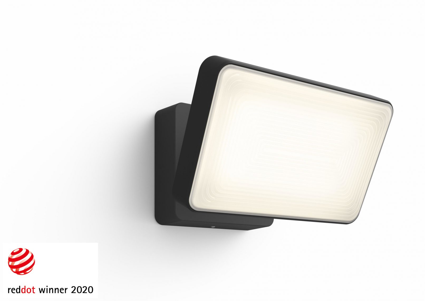 This floodlight was designed as a visually appealing product solution for outdoor use. It is easy to install and flexible in use, delivering a bright white light that can also be dimmed remotely to create different lighting atmospheres. The discreetly designed housing made of black metal and synthetic material showcases smooth, rounded corners. When dimmed down, the white diffuser reveals a subtle line pattern that further emphasises the attention to detail that went into the design.
